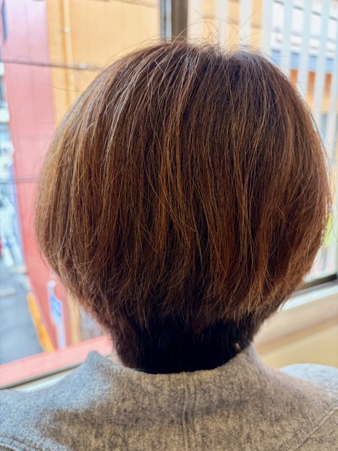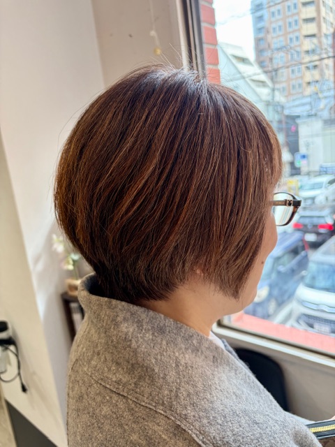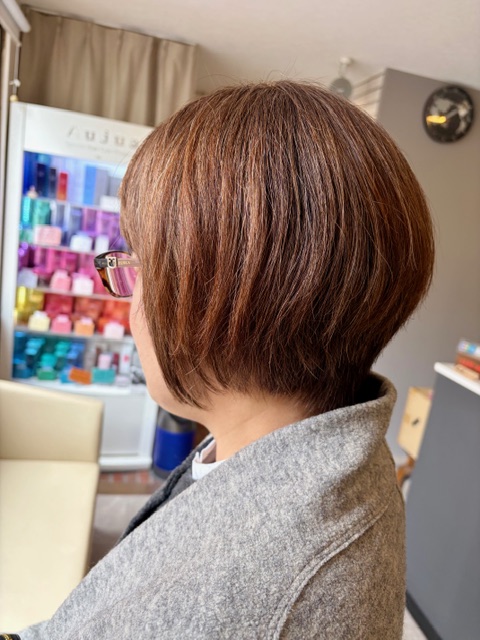 ちょっとアシメなグラボブ 2026/1/31 こんにちはテルソの田中です。何かまだまだ寒いですね。自分は低体温なんで、末端が冷えて辛い今日この頃です笑笑で今回のゲスト。常連客のN様。。。カットは少しだけアシンメトリーのグラデーションボブにして、カラーは明るめの白髪染&ハイライトを入れ、白髪が伸びてきても目立たない様にカラーリングしました。 少し早いですが、春先に向けてはミックスしたベージュ系カラーが流行るのかなぁと思います。気になる方はぜひぜひご相談下さいね。。。